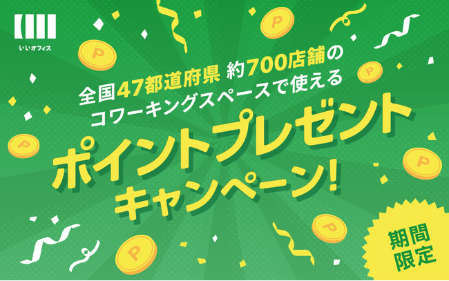 全国47都道府県に約700店舗のコワーキングスペースを展開する株式会社いいオフィス(本社:東京都港区、代表取締役:龍崎 宏 以下、「いいオフィス」)は、新しい働き方の普及・推進を目的に、コワーキングスペースで利用可能なポイントプレゼントキャンペーンを実施いたします。