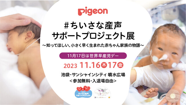 ピジョン株式会社(本社:東京、社長:北澤 憲政)は、専門的なケアを必要とする赤ちゃんとご家族を支援する「ちいさな産声サポートプロジェクト」の1つとして、11月17日の世界早産児デーに合わせ、「#ちいさな産声サポートプロジェクト展 ~知ってほしい、小さく早く生まれた赤ちゃん家族の物語~」を2023年11月16日(木)~17日(金)に池袋・サンシャインシティ 噴水広場にて開催いたします。