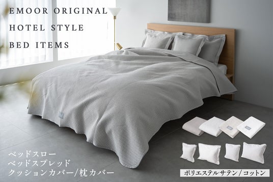 EMOORオリジナルの「視覚と触覚で楽しむベッドカバーシリーズ」は、ベッドスプレッド・ベッドスロー・クッションカバー・枕カバーと豊富なアイテム展開で、ホテルのような洗練された空間を演出します。