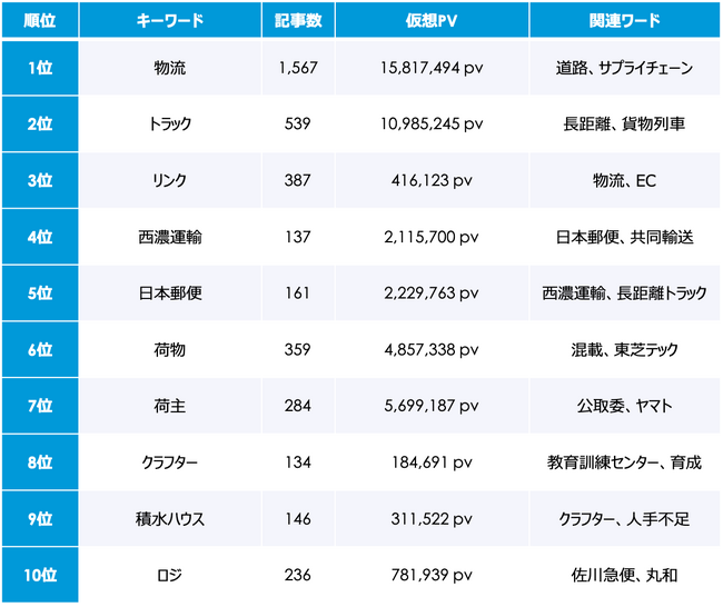 4位と5位は、西濃運輸と日本郵便の長距離トラックでの共同輸送開始のニュース。両社は2月から4月にかけて共同輸送の試験運用を行っており、その結果を踏まえての決定とのこと。