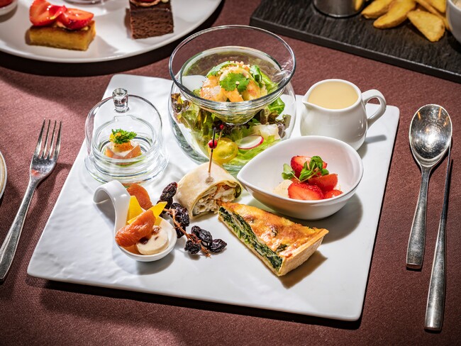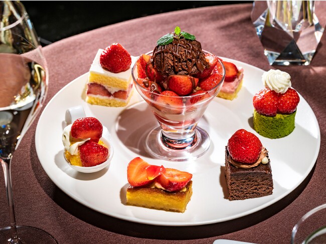 きめ細やかなおもてなしと素材の持ち味を活かした本格フレンチで、幅広い年代のお客様にご好評をいただいている「ベイ・ビュー」。レストランシェフ西村が手掛ける上質で洗練されたフランス料理と20種類以上のフリーフローがセットになった人気の「#Gatherings」に、ブランド苺“あまおう”を贅沢に使用したストロベリースイーツをお楽しみいただけるスペシャルメニューが新登場。「エビとアボカドのエスニックマリネとサラダ」や「ベーコンとほうれん草のキッシュ」などフリーフローのお飲み物が思わずすすむオードブルや、旬のフレッシュ苺を使用した「苺とトマトモッツアレラチーズのカプレーゼ」もご提供。メインディッシュには本格フレンチならではの逸品として「白身魚とムール貝のマリニエール風」や「牛フィレ肉 柚子胡椒風味のオニオンコンフィ 雅ソース」をお楽しみいただけます。そして、こだわりのデザートプレートには香り高い“あまおう“とベネズエラ産最高級カカオ“チュアオ“を贅沢に使用した「ストロベリーチュアオチョコレートのパフェ」や王道の「ストロベリーショートケーキ」、揚げたドーナツにストロベリークリームがたっぷり入った「苺のボンボローニ」など、魅力的な7種類ものストロベリースイーツをご用意いたします。