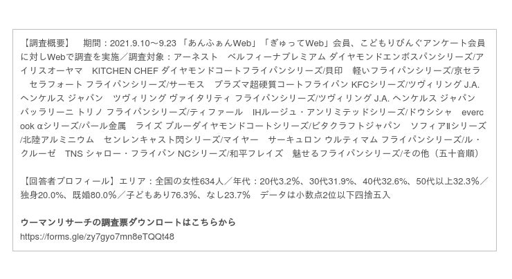 園児とママの情報誌「あんふぁん」「ぎゅって」を発行する株式会社こどもりびんぐ(所在地:東京都千代田区、代表取締役:中島一弘)は、「シルミル研究所」としてリサーチ事業を展開しています。「シルミル研究所」では、女性を対象にした調査「ウーマンリサーチ」を実施し、女性が選ぶおすすめの商品やサービスをランキング形式で、Webコンテンツとして発信しています。今回は2021年9月に実施した「フライパン」についての調査結果を発表いたします。