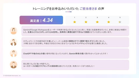 吉積情報では、これまで導入支援プログラム「AI Driven」を通じて多くの企業の生成 AI 活用を支援してまいりました 。この度、現場ユーザー自らが AI を活用した自動化フローを構築できるよう、最新の「Google Workspace Studio」に特化した実践型トレーニングを開発いたしました。