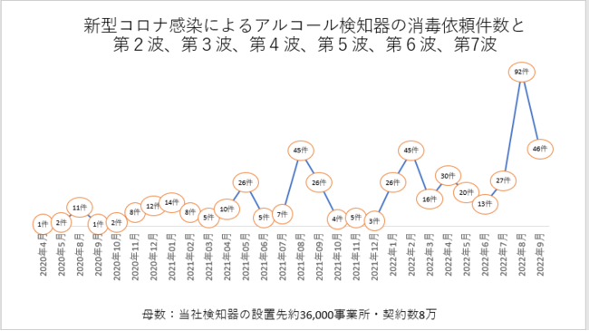 【グラフ1:新型コロナ感染によるアルコール検知器の消毒依頼件数と第2波、第3波、第4波、第5波、第6波、第7波】