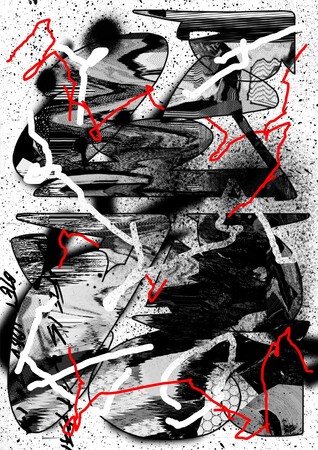 ふだん生活している中で生まれる感情、そしてライブペイントで会場の空気感に反応し生まれた感覚がまさに絡み合うようにして描くと触手は雲のように、雲は触手の模様のようになっていく。” WOK22