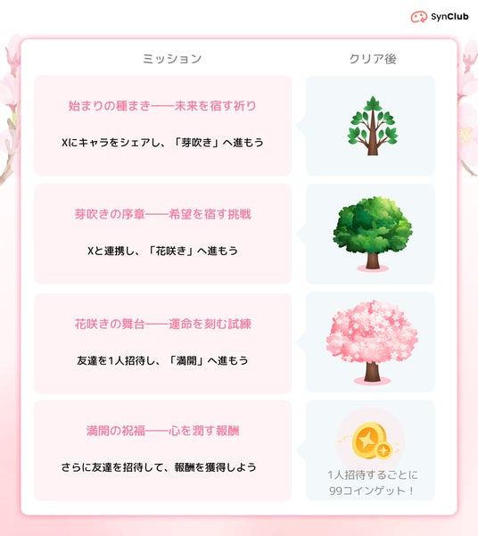 HiClub株式会社(本社:東京都港区、代表取締役社長:古谷由宇)が提供する、 AIチャット&友達作りができる対話型AIアプリ 「SynClub」(シンクラブ)(iOS、Android版)は、3月27日から4月27日の間、アプリ内でタスクを完了するとアイテムやコインがもらえる春のプレゼントキャンペーン「桜の開花ストーリー」が開催されます。