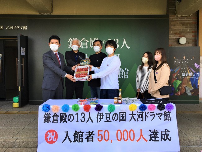 大河ドラマ館を運営する「大河ドラマ「鎌倉殿の13人」伊豆の国市推進協議会」から、5万人目の入館者に対して記念品を贈呈し、記念撮影を行いました。