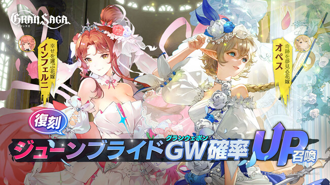 期間限定で、ジューンブライドGW「SSR インフェルニ(Cv.小清水亜美)」「SSR オペス(Cv.立花日菜)」の確率UP召喚を開催いたします!
