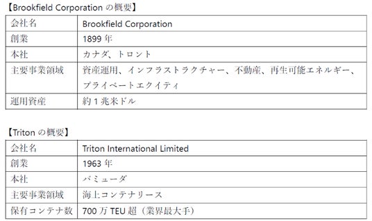 Brookfieldは、運用資産が1兆米ドルを超える世界有数の投資会社であり、インフラストラクチャー、再生可能エネルギー、不動産、プライベートエクイティなど幅広い分野で投資実績を有します。Tritonは、世界47ヵ国でコンテナリース事業を展開しており、保有コンテナ数は700万TEU※を超え、圧倒的な事業規模とグローバルネットワークを有しています。