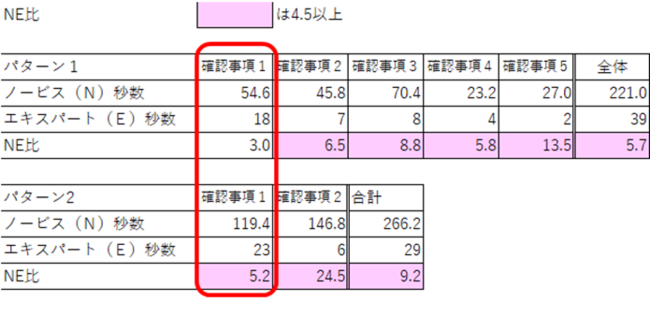 パターン1と2の確認事項別のNE比を計算しました(表2)。NE比とは、何かを使用したときのノービス(初心者)の所要時間とエキスパート(熟練者)の所要時間で割ったものです(例:ノービスが5秒、エキスパートが1秒なら5÷1で、NE比は5.0)。NE比は4.5を超えると、初心者にわかりづらいので改善が必要とされています。