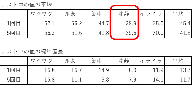 脳波計測では、電通サイエンスジャム製の感性アナライザーで、「ワクワク度」「興味」「集中」「沈静」「ストレス」の5つの感性の平静時からの変化の値を計測。その結果、メンタルモデルの構築されていない1回目は「沈静」以外の平均値が高く、1回目は「ワクワク」「イライラ」しながら利用していたことがわかりました。(表1)