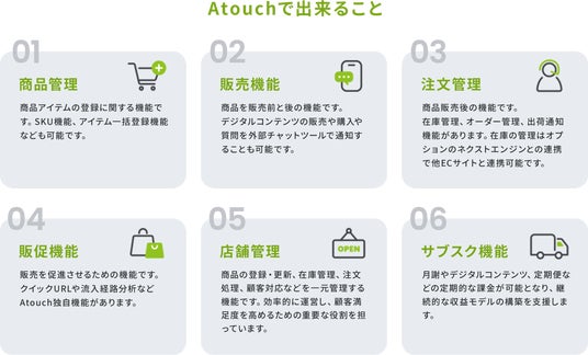 - 販促機能:販売を促進させるための機能。クイックURLや流入経路分析などAtouch独自機能がある