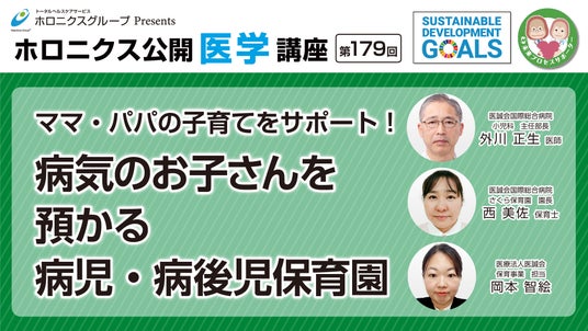 医療法人医誠会(大阪府大阪市 代表者:谷 幸治)は、第179回オンライン公開医学講座『ママ・パパの子育てをサポート! 病気のお子さんを預かる 病児・病後児保育園』を3/21(木)にYouTubeにて配信しました。
