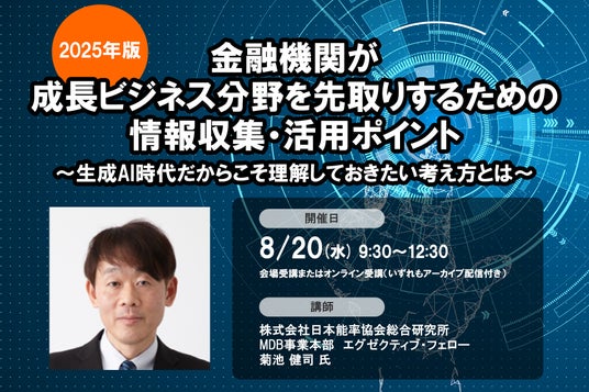 株式会社セミナーインフォ(本社:東京都千代田区 代表:小西 亘)は、2025年8月20(水)に「<2025年版>金融機関が成長ビジネス分野を先取りするための情報収集・活用ポイント~生成AI時代だからこそ理解しておきたい考え方とは~」を開催いたします。
