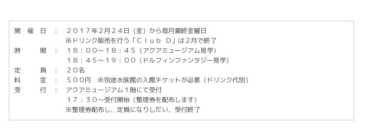 水族館「アクアミュージアム」と「ドルフィン ファンタジー」では、大人のためのプレミアムフライデー限定のナイトツアー『大人のナイトツアー』をご用意しました。2016年冬季より好評開催中の「楽園のナイトアクアリウム」演出となった夜の水族館内を、ベテランの飼育員から「生きものたちの夜の過ごし方」や「オスとメスの違い」、「求愛行動や繁殖行動」などの解説を受けながら巡るプレミアムツアーです。
