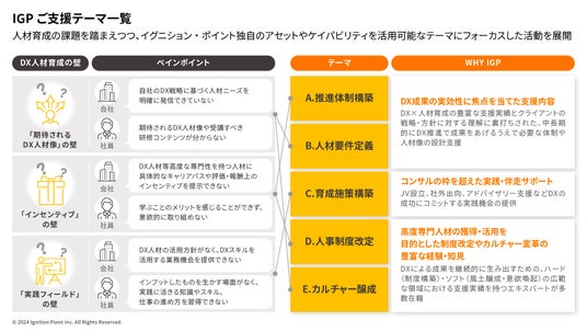 新事業創出やDXを強みに、クライアントのイノベーションや変革を支援するイグニション・ポイント株式会社(本社:東京都渋谷区、代表取締役社長:末宗喬文、以下「イグニション・ポイント」)は、DX推進の更なる加速に向けて、より企業の現状に即したDX人材育成支援サービスをアップデートしました。本支援サービスを通じて、クライアント企業が直面する人材育成の課題を解決し、DX推進の成功を強力に支援してまいります。