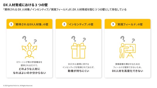 多くの企業がDX推進と並行して、DXを支える社内人材の育成にも取り組んでいます。しかし、その進展にはばらつきがあり、スムーズに進んでいない企業も少なくありません。イグニション・ポイントでは、社内DX人材育成が滞る主な要因として、期待されるDX人材像の不明確さ、インセンティブの欠如、実践フィールド不足の3つの壁が存在すると考えています。