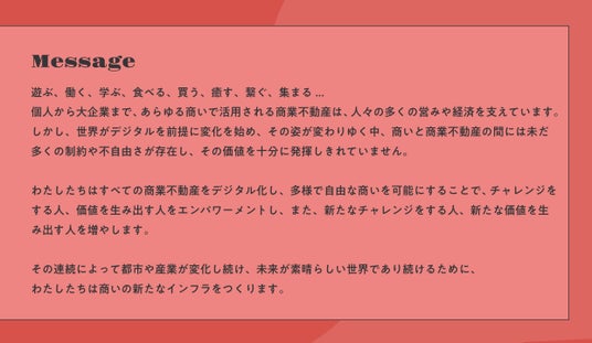わたしたちはすべての商業不動産をデジタル化し、多様で自由な商いを可能にすることで、チャレンジをする人、価値を生み出す人をエンパワーメントし、また、新たなチャレンジをする人、新たな価値を生み出す人を増やします。
