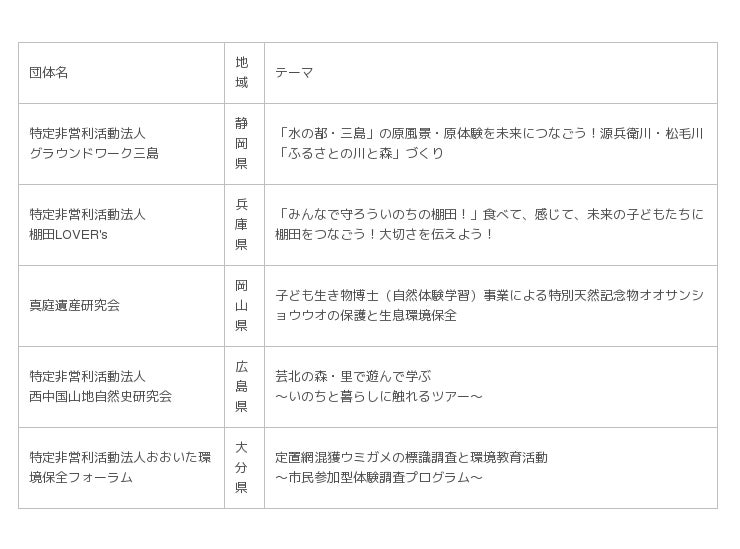生物多様性の啓発・保全活動を実施する協働団体を募集し、29団体の応募から以下の5団体が選ばれました。