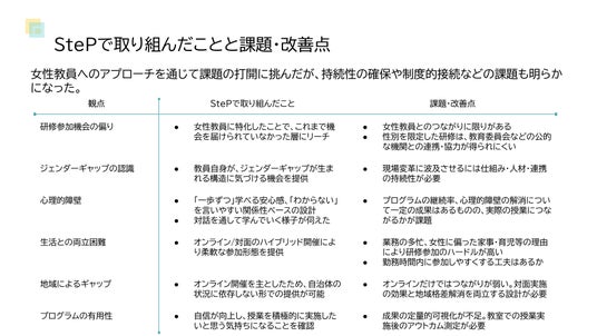 加えて、3年間のSteP実施を通して気づいた、女性教員の研修参加を阻む制度的・文化的な壁や心理的な障壁を考察しました。