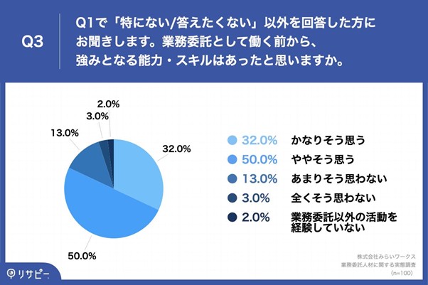 Q1で「特にない/答えたくない」以外を回答した方に、「Q3.業務委託として働く前から、強みとなる能力・スキルはあったと思いますか。」(n=100)と質問したところ、「かなりそう思う」が32.0%、「ややそう思う」が50.0%という回答となりました。