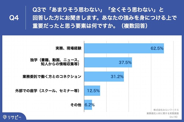 Q3で「あまりそう思わない」「全くそう思わない」と回答した方に、「Q4.あなたの強みを身につける上で重要だったと思う要素は何ですか。(複数回答)」(n=16)と質問したところ、「実務、現場経験」が62.5%、「独学(書籍、動画、ニュース、知人からの情報収集等)」が37.5%、「業務委託で働く方とのコネクション」が31.2%という回答となりました。