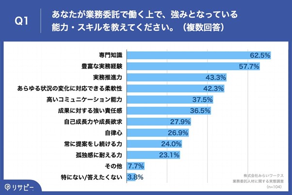 「Q1.あなたが業務委託で働く上で、強みとなっている能力・スキルを教えてください。(複数回答)」(n=104)と質問したところ、「専門知識」が62.5%、「豊富な実務経験」が57.7%、「実務推進力」が43.3%という回答となりました。