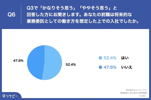 Q3で「かなりそう思う」「ややそう思う」と回答した方に、「Q6.あなたの前職は将来的な業務委託としての働き方を想定した上での入社でしたか。」(n=82)と質問したところ、「はい」が52.4%、「いいえ」が47.6%という回答となりました。