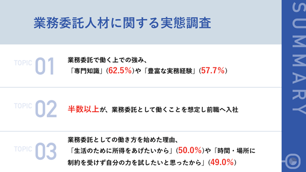 今回の調査では、業務委託を行う上で、専門知識に並び、実務経験も強みとして生かされている実態が明らかになりました。将来的に業務委託として働くことを想定して前職に入社した方も多く、知識や経験、またコミュニケーション能力や提案力など、企業で業務を行いながら習得し、その後生活のために所得をあげるためにはもちろんのこと、場所や時間に制約を受けずに自分の力が試せる業務委託としての働き方に切り替えた方が多いようです。業務委託やフリーランスと聞くとハードルを高く感じますが、すでに多くの方が取得している勤め先企業での経験が強みとして活きてくるのかもしれません。