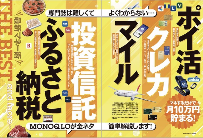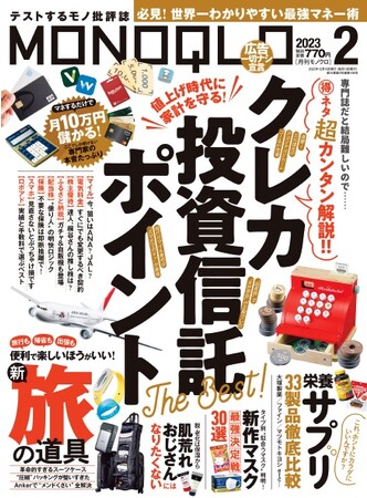 2023年2月号は、値上げ時代に家計を守る「クレカ・投資信託・ポイント最新マネー術」を大特集。ポイント還元を狙うならクレカ、戦略的なポイ活、安定の定期収入をゲットできる高配当ETF&投信など、超簡単にできるお得なネタが大集合!! さらに、年末年始に間に合う「旅行の道具便利帳」では、フード付きネックピローやポータブル電気ケトルなど、あると便利な旅行に役立つアイテムを集めました。そのほかにも、専門家に取材してわかった「間違いだらけだったサプリ選び」や、毎日着けても苦にならない最高の1枚が見つかる「最新マスク30製品ABC判定」など、今欲しい情報満載でお届けしています。本リリースでは、編集部が“本当におすすめできる”製品の一部をご紹介します。