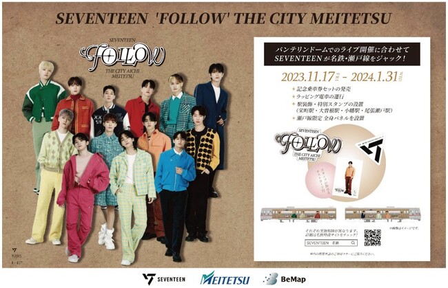株式会社ビーマップ(本社:東京都千代田区、代表取締役:杉野文則、以下当社)は、名古屋鉄道株式会社(本社:愛知県名古屋市、代表取締役社長:高崎裕樹、以下「名鉄」)がBTSやSEVENTEEN、TOMORROW X TOGETHERなど世界的アーティストが所属するレーベルを擁するエンターテインメントライフスタイルプラットフォーム企業HYBEの日本本社であるHYBE JAPAN(ハイブ ジャパン)(所在地:東京都港区、CEO:ハン・ヒョンロック)が主催する「SEVENTEEN 'FOLLOW' THE CITY AICHI」プロジェクトとのコラボレーション施策に協力いたしましたことをお知らせいたします。