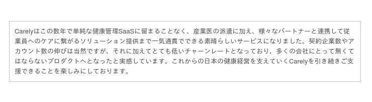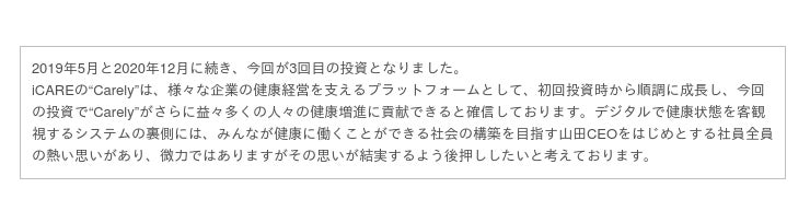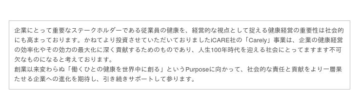 このたびの調達によって、Carelyの認知拡大に加え、従業員への健康投資が事業成長につながる有用性を証明するために、健康ビッグデータをより一層活用するプロダクト開発を加速してまいります。またそれらに伴う、人材採用と組織体制の強化に引き続き注力してまいります。