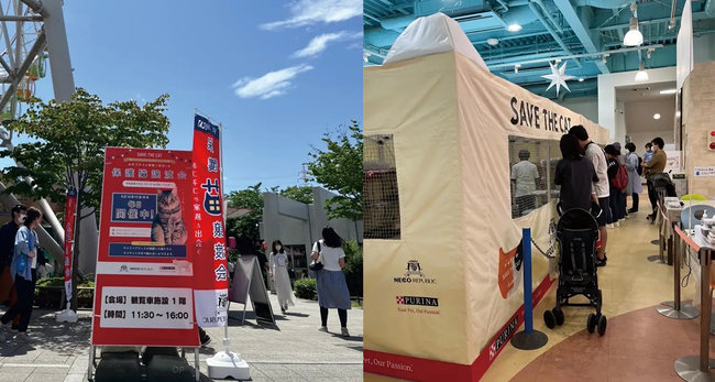 保護猫テントハウスが設置され、広々とした空間で行う「保護猫譲渡会」
