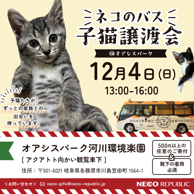 殺処分ゼロを目指して全国で9拠点、保護猫カフェや保護猫施設を運営する株式会社ネコリパブリック(所在地:東京都台東区、代表取締役:河瀬麻花)は、12月3日(土)~1月29日(日)、パーキングエリアも直結している公園「オアシスパーク 河川環境楽園」にて保護猫譲渡会を期間中毎日開催いたします。
