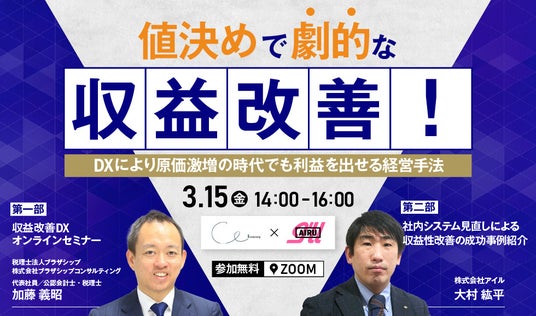 自社開発の業務管理システムで企業の経営力向上を支援する株式会社アイル(本社:大阪市北区・東京都港区、代表取締役社長:岩本哲夫、東証プライム:3854)と、税理士法人ブラザシップ(所在地:東京都新宿区・愛知県名古屋市・愛知県小牧市、代表社員:加藤義昭)は、2024年3月15日(金)に収益性の改善を目指す事業者さまに向けて、無料オンラインセミナー「“値決めで劇的な収益改善!”DXにより原価激増の時代でも利益を出せる経営手法」を開催します。