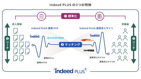 世界 No.1 求人サイト(※2)「Indeed(インディード)」は、求人配信プラットフォーム「Indeed PLUS(インディードプラス)」を、2024年1月30日より提供開始いたします。Indeed PLUSは、複数の求人サイト(Indeed PLUS連携求人サイト)と複数のATS(※3)(Indeed PLUS連携ATS)をつなぎ、多様な求職者と多様な仕事の効果的なマッチングを実現する求人配信プラットフォームです。Indeedは世界60ヵ国以上でサービス展開していますが、Indeed PLUSの導入は日本市場が初めてとなります。