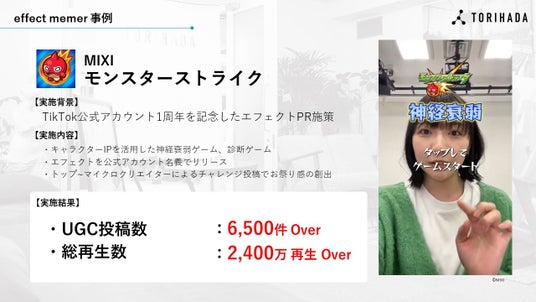 株式会社MIXI様とのお取組みでは、スマートフォンアプリゲーム「モンスターストライク」のTikTok公式アカウント開設1周年を記念したエフェクトPR施策を実施いたしました。プロダクト特性であるキャラクターデザインを活かした神経衰弱ゲームエフェクトや、ゲーム内のステータス画面を活かした診断エフェクトを制作し、UGC投稿数6,500件以上・総再生数2,400万再生以上*と、多くのユーザーエンゲージメントを獲得する盛り上がりを見せました。*2024/5/17時点の数値▼モンスト神経衰弱