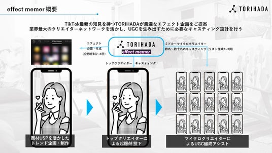 インフルエンサーを活用したショートムービーマーケティング事業を行う株式会社TORIHADA(本社:東京都渋谷区、代表取締役社長:若井 映亮)は、ユーザーの利用ハードルが低くサクっと遊べるTikTokエフェクトを作成し、インフルエンサーを適切にキャスティングしPR投稿を行うことで、大量のUGC増殖を目論むサービス『effect memer(エフェクト ミーマー )』の提供を2024年5月より開始いたしました。