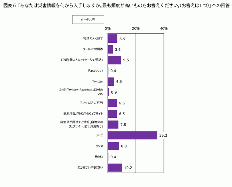 災害情報を何から入手するかを聞いたところ(図表6)、最も割合が高かったのは「テレビ」(35.2%)でした。「テレビ」と来たら「ラジオ」が来そうなものですが、2位は「LINE(個人とのメッセージや通話)」(9.5%)です。