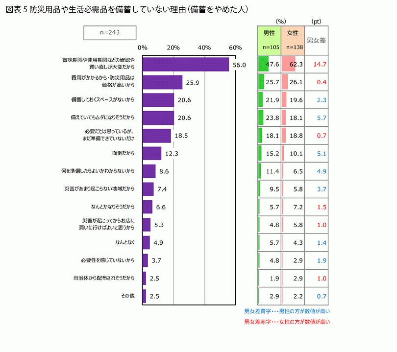 次に防災用品や生活必需品を「備蓄していない」「備蓄していたがやめた」人たちに、その理由を尋ねました。「備蓄していない」人の場合(図表4)、最も多かったのは「必要だとは思っているが、まだ準備できていないだけ」(39.5%)という回答です。男女別で見てもこの回答が最多であることに変わりはないのですが、男性は32.6%、女性は47.4%と大きな差がありました。また、「何を準備したらよいかわからないから」(全体:13.2%、男性:9.6%、女性:17.4%)と回答した人も男女差が大きかったです。
