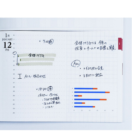 セパレートダイアリーは手帳の中心部が上下で分かれる仕様です。見開き1ページで手帳2冊分の用途役割を果たす点が他社にない独自の特長です。月間・週間・日々のTODO管理・ガントチャートを見開き1ページで確認できます。ページの移動をせず、月間の予定を見ながら一週間の予定や1日の予定を見ることができる点が支持され2011年の発売以来累計約135,000冊を販売しました。