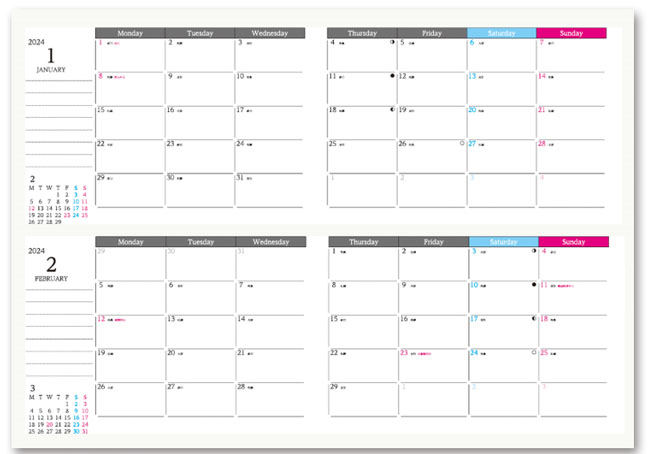 ・2ヶ月分の月間予定を見開き1ページで確認・管理できる