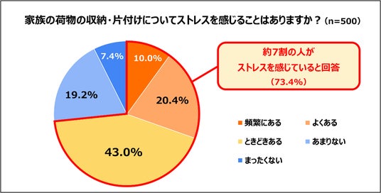 家族の荷物の収納・片付けについてストレスを感じるか尋ねたところ、「頻繁にある」(10.0%)、「よくある」(20.4%)、「ときどきある」(43.0%)を合わせて、全体の7割超(73.4%)が「ストレスを感じている」と回答しました。家族の荷物の収納・片付けが多くの家庭にとって大きな負担であることが明らかとなりました。
