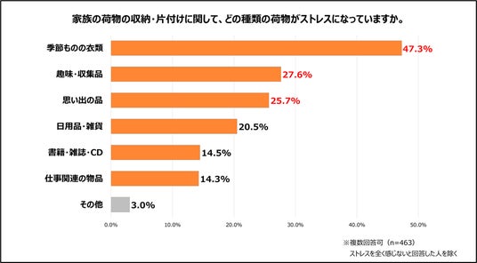 続いて、家族の荷物の収納・片付けでストレスを感じる荷物の種類について尋ねたところ、「季節ものの衣類」(47.3%)が最も多く、約半数の家庭で衣替えなどの管理が負担になっていることが分かりました。次いで「趣味・収集品」(27.6%)、「思い出の品」(25.7%)が続き、収納場所や管理方法に悩む家庭が多いことがうかがえます。「日用品・雑貨」(20.5%)、「書籍・雑誌・CD」(14.5%)、「仕事関連の物品」(14.3%)も一定数の家庭でストレスの原因となっています。