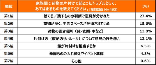 家族間で荷物の片づけで起こったトラブルについて尋ねたところ、最も多かったのは「捨てる/残すものの判断で意見が分かれた」(27.4%)、次いで「荷物が多く、生活スペースが圧迫されている」(15.6%)、「荷物の置き場所(靴・衣類・本など)で意見が分かれた」(13.8%)、「片付け方(収納方法・ルール)について意見の行き違いがあった」(12.1%)と続き、家庭内での整理・収納の調整が必要な場面が多いことがうかがえます。