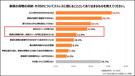 さらに、「自分のスペースが狭くなる」(17.9%)や「家族の荷物が多く、収納スペースが常に圧迫されている」(11.9%)といった回答も一定数あり、「収納スペース不足」にストレスを感じていることが分かりました。
