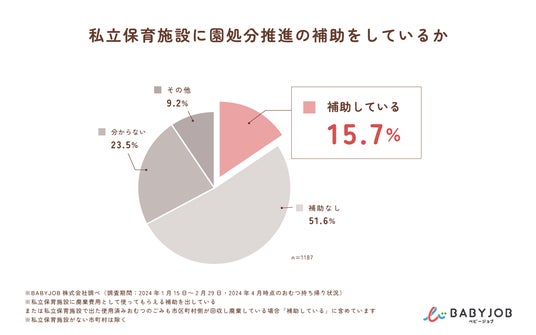 市区町村内の私立保育施設に使用済みおむつの廃棄費用を補助しているか調査したところ、補助をしている市区町村はわずか186(15.7%)であることが分かりました。