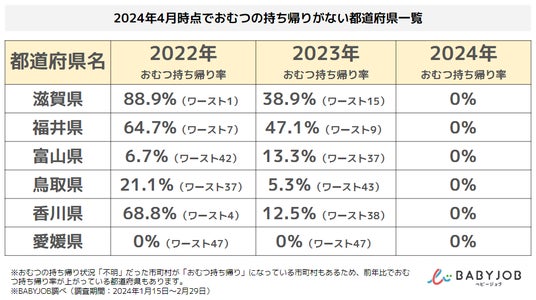 - 2022年時におむつの持ち帰り率が1位だった滋賀県は、いまでは持ち帰りゼロに