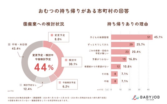 - 113の市町村が「2024年4月時点ではおむつは持ち帰り」と回答したが、そのうち約半数が今後おむつ持ち帰りをやめる予定・検討中だと回答。