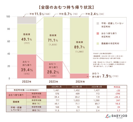 BABY JOB株式会社(本社:大阪府大阪市、代表取締役社長 上野公嗣)が運営する「保育園からおむつの持ち帰りをなくす会」は、公立保育施設がある全国1,427の市区町村の保育課に対して、公立保育施設で使用済みおむつを保護者に持ち帰らせているかを電話調査しました。